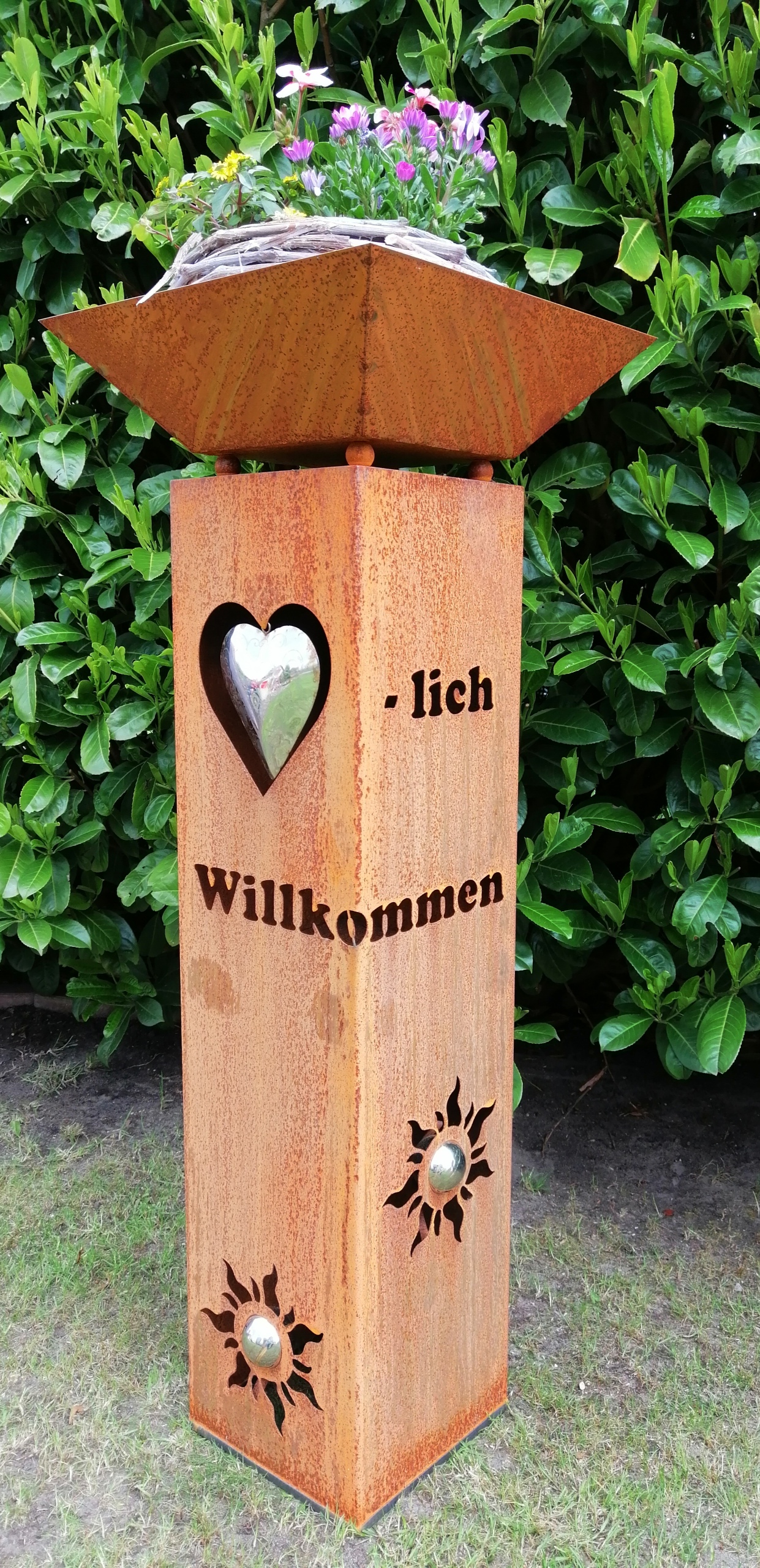 Diese wunderschöne Blumensäule Herzlich Willkommen mit Edelstahlherz verleiht Ihrem Zuhause einen ganz besonderen Look. Der Herzlich Willkommen wird ergänzt durch ein großes Edelstahlherz (abnehmbar) auf der linken Seite der Rostsäule. Die Rostsäule wird inklusive der Pflanzschale und einem Kantenschutz für empfindliche Böden geliefert.