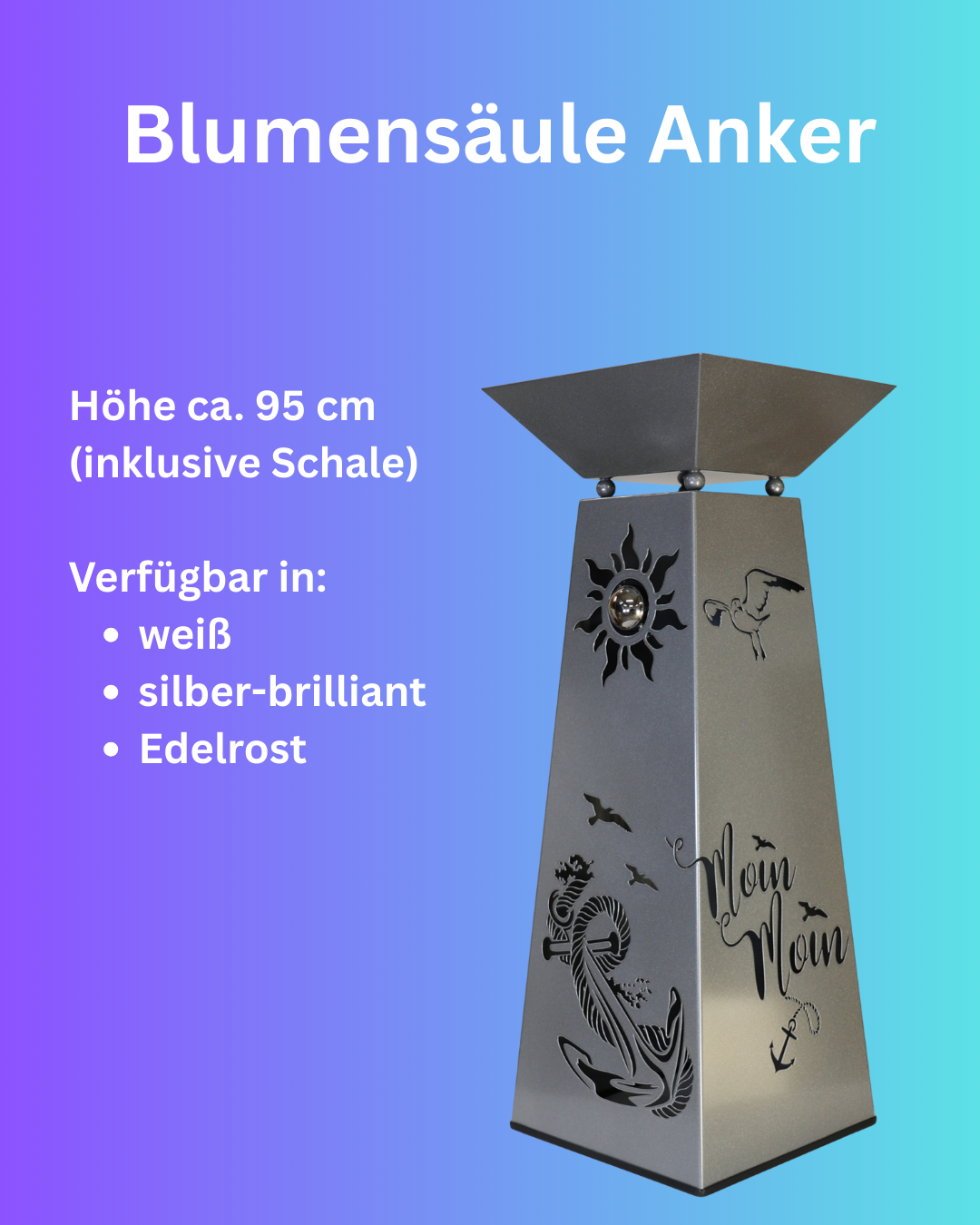 Diese wunderschöne Dekosäule Anker verleiht Ihrem Zuhause einen ganz besonderen Look. Das Motiv Anker wird ergänzt durch den Schriftzug Moin Moin auf der rechten Seite der Dekosäule. Die Säule wird inklusive der Pflanzschale und einem Kantenschutz für empfindliche Böden geliefert.