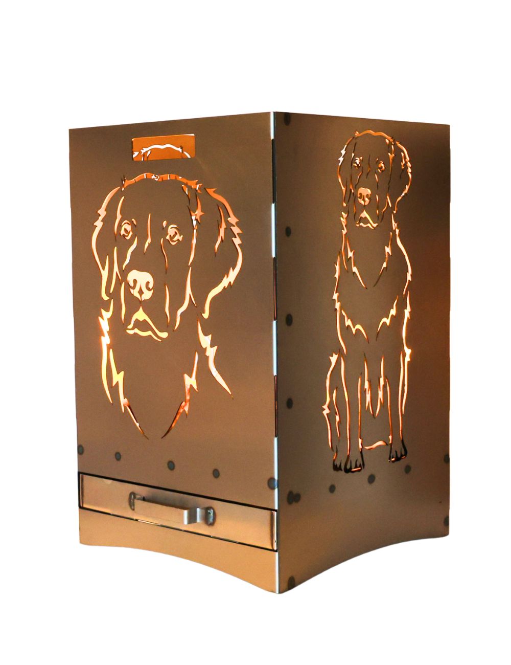 Das Motiv eines Golden Retriever auf dem Feuerkorb wird ergänzt durch den Kopf des Hundes. Die Motive sind gegenüberliegend auf jeweils zwei Seiten des Feuerkorbes abgebildet.