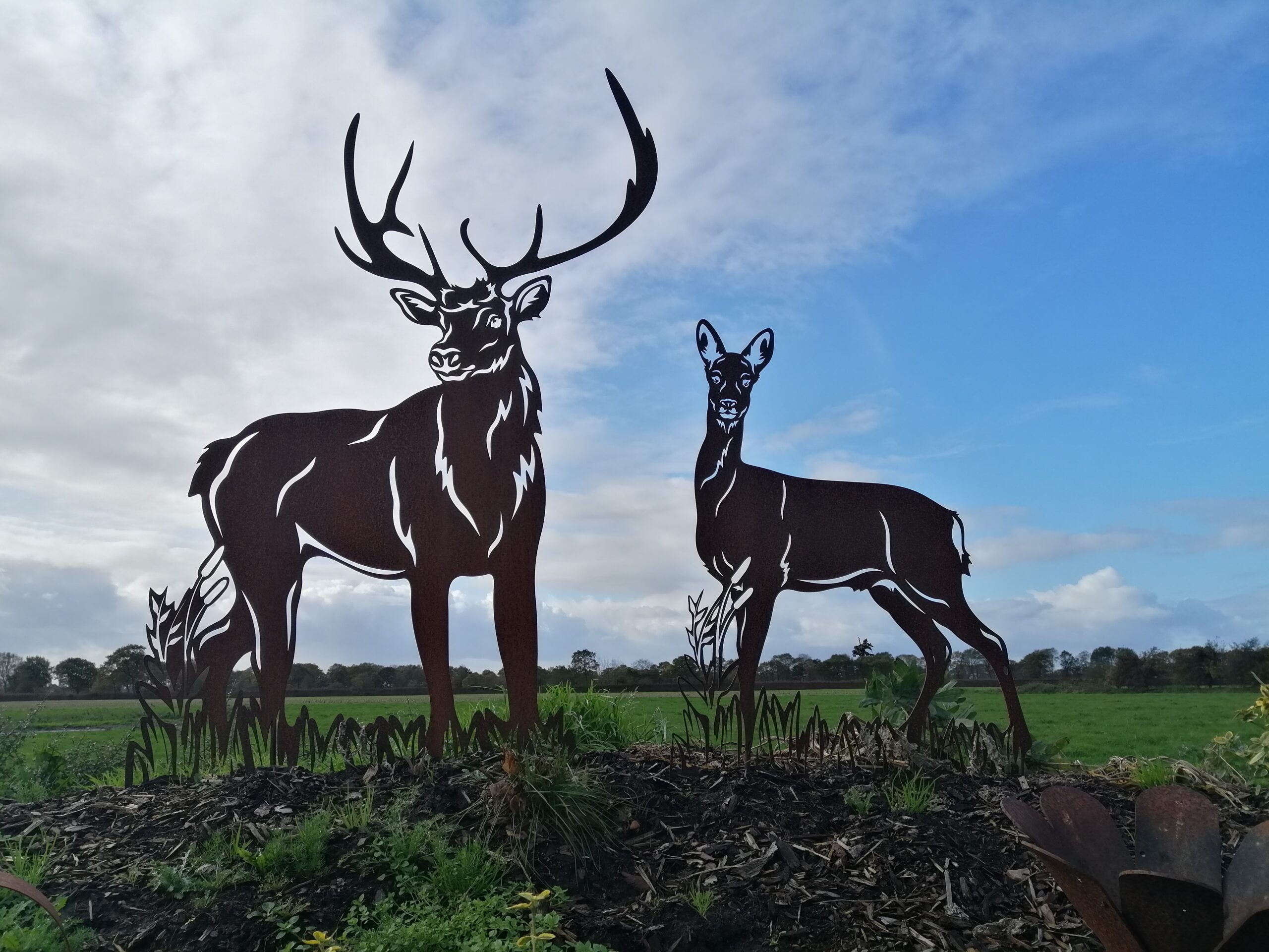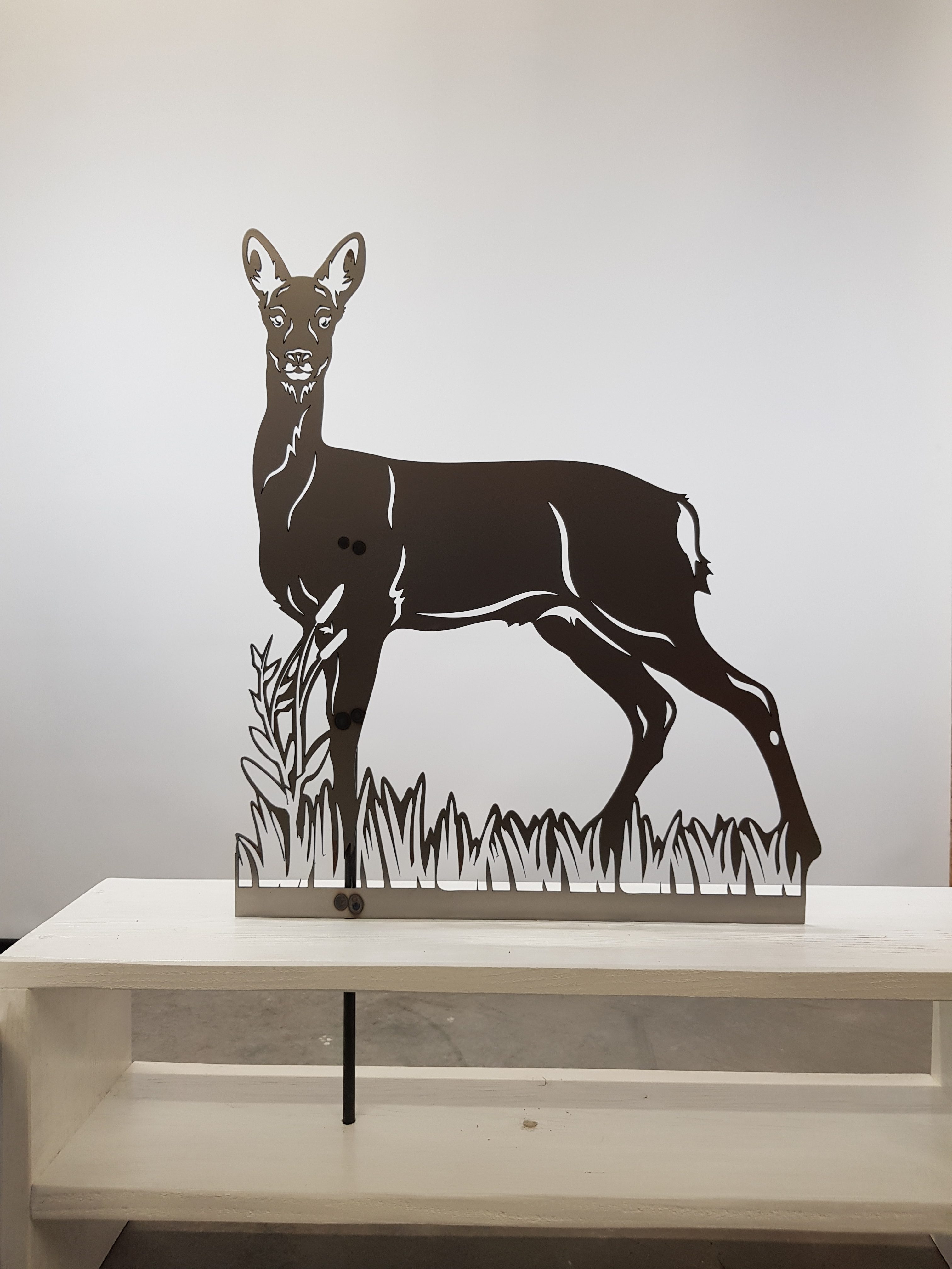 Diese schönen Gartenstecker Hirsch, Reh oder Rehkitz aus 2 mm Stahlblech werden Ihnen in blank geliefert. Innerhalb kurzer Zeit bildet sich im Außenbereich eine schöne Rostpatina. Auf der Rückseite der Gartenstecker sind jeweils zwei Rundstäbe angeschweißt, mit dem können Sie Ihre Figur Hirsch, Reh oder Rehkitz ganz bequem in Ihrem Beet oder auf dem Rasen befestigen. Sofern Sie die Figur auf einem festen Untergrund wie Pflasterstein oder Fliesen stellen möchten, können wir anstelle des Stabes eine Bodenplatte anbringen. Bitte geben Sie uns diesen Wunsch im Bestellprozess unter “Anmerkungen” mit auf.
