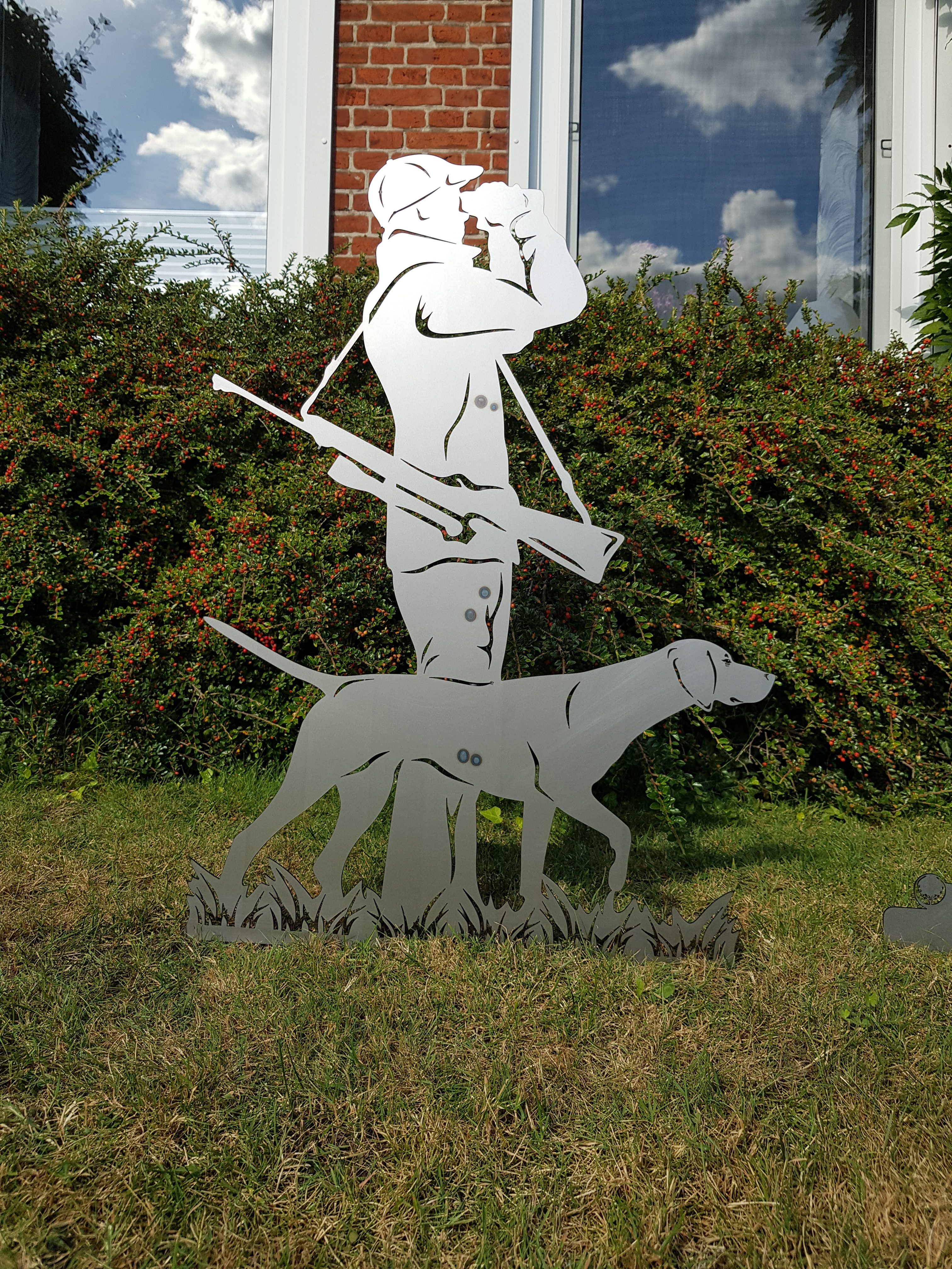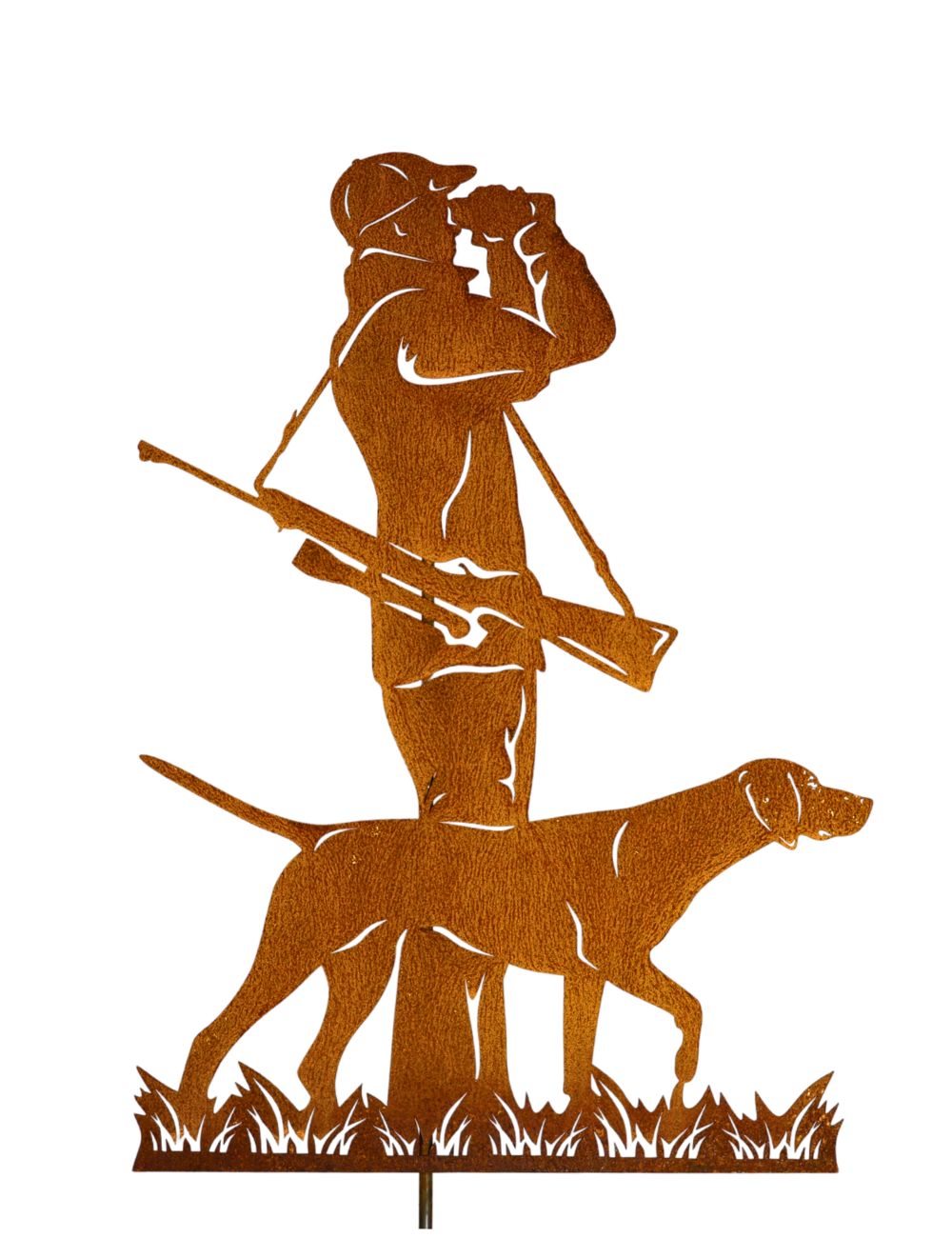 Dieser schöne Gartenstecker Jäger mit Hund aus 2 mm Stahlblech wird Ihnen in blank geliefert. Innerhalb kurzer Zeit bildet sich im Außenbereich eine schöne Rostpatina. Auf der Rückseite des Gartensteckers ist ein Rundstab angeschweißt, mit dem können Sie Ihre Figur mit dem Jäger und dem Hund ganz bequem in Ihrem Beet oder auf dem Rasen befestigen. Sofern Sie die Figur auf einem festen Untergrund wie Pflasterstein oder Fliesen stellen möchten, können wir anstelle des Stabes eine Bodenplatte anbringen. Bitte geben Sie uns diesen Wunsch im Bestellprozess unter “Anmerkungen” mit auf.