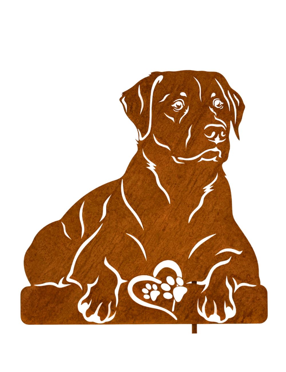 Dieser schöne Gartenstecker Labrador aus 2 mm Stahlblech wird Ihnen in blank geliefert. Innerhalb kurzer Zeit bildet sich im Außenbereich eine schöne Rostpatina. Auf der Rückseite des Gartensteckers ist ein Rundstab angeschweißt, mit dem können Sie Ihre Labrador-Figur ganz bequem in Ihrem Beet oder auf dem Rasen befestigen. Sofern Sie die Figur auf einem festen Untergrund wie Pflasterstein oder Fliesen stellen möchten, können wir anstelle des Stabes eine Bodenplatte anbringen. Bitte geben Sie uns diesen Wunsch im Bestellprozess unter “Anmerkungen” mit auf.